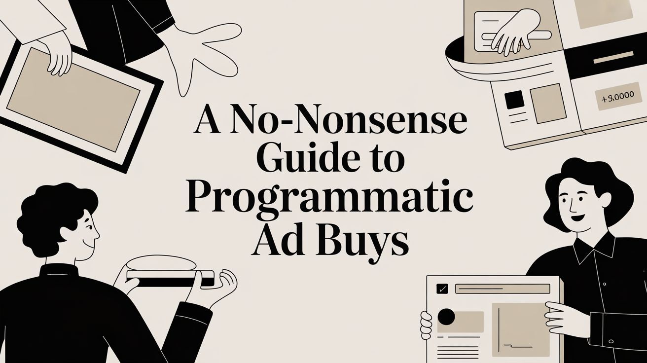 Let's be blunt. You've heard the term "programmatic ad buys," probably from an agency trying to justify its high fees or explain away murky results. Forget the jargon. Think of it as an automated, high-speed stock market for digital ads. Instead of manually negotiating with websites, software does it for you in milliseconds. Managed correctly, this gives you incredible targeting power on a massive scale. Managed poorly, it's the fastest way to burn your marketing budget. What Are Programmatic Ad Buys, Really? Most business owners I talk to have a vague idea of programmatic. Worse, they've been burned by an agency that used it as a black box to hide poor performance and pocket the difference. Let's clear that up right now. Programmatic buying is your way out of the "walled gardens" of Google and Meta. Instead of being locked into a single platform's inventory, you get access to millions of websites, apps, and even Connected TV channels. It allows for a level of surgical audience targeting that goes far beyond what you can do with standard keywords or interests in Google Ads. Why It Matters More Than Ever This isn't some fleeting trend. The programmatic advertising market is projected to grow from $15.68 billion in 2025 to a staggering $38.84 billion by 2030 . That's not hype; it's where smart money is moving. And it’s not just for massive corporations. I’ve helped small and mid-sized businesses use it to punch way above their weight class, reaching customers their larger competitors miss because their bloated agency is too lazy to dig deep. The engine behind all this is the Demand-Side Platform (DSP) . To get a handle on this, it's worth understanding what is DSP advertising and how these platforms automate the buying process. The Core Advantages for Your Business For a business owner, this isn't just about buying ads differently—it's about buying them smarter. The benefits have a direct line to your bottom line. The real power of programmatic isn't just automation; it's the intelligence behind it. You’re not just buying ad space—you're buying access to a specific person, at the perfect moment, for the lowest possible price. That’s a level of efficiency that manual buying can never match. Here’s what that efficiency actually delivers: Massive Reach: Get your ads on a huge portion of the open internet, not just one network. Pinpoint Targeting: Layer demographic, behavioral, location, and contextual data to find your exact customer. Real-Time Optimization: The system is constantly learning, shifting budget to what works and cutting what doesn’t to maximize your Return on Ad Spend (ROAS) . Data-Driven Insights: Uncover new audience segments and behaviors you never knew existed, giving you intelligence you can use across all your marketing. Programmatic is a powerful piece of the larger puzzle. If you're still building your foundation, our practical guide to digital advertising for business owners is a good place to start. Just remember, any tool is only as good as the specialist using it. Your focus should be on ROI, not on funding an agency's overhead. How the Programmatic Ad Engine Works This is where most guides throw a wall of technical jargon at you. Forget that. The engine behind programmatic advertising is a lot more straightforward than most agencies want you to believe. Think about booking a flight. You don't call Delta, then United, then American to compare prices. You use a site like Expedia, punch in your destination, and see all your options in one place. You pick the best flight for the best price, and it's booked. Programmatic advertising is the same idea. Instead of manually calling and negotiating with thousands of different websites for ad space, you use a central platform to bid on their available inventory in a massive, real-time auction. The Key Players in a Programmatic Buy To get how this works, you only need to know the three main components. It’s not as complicated as it sounds. Demand-Side Platform (DSP): This is your command center—your Expedia for ads. It's the software where you, the advertiser, set up campaigns, define who you want to reach, lock in your budget, and upload your ad creative. The DSP’s entire job is to go out and find the most valuable ad space for your money across the web. Supply-Side Platform (SSP): This is the tool publishers (the websites with ad space) use to sell their inventory. The SSP helps them manage all their ad slots and offer them up to the largest pool of potential buyers, trying to get the highest price for every impression. Ad Exchange: Think of this as the New York Stock Exchange, but for digital ads. It’s the open marketplace where the DSPs (buyers) and SSPs (sellers) meet. In the fraction of a second it takes for a webpage to load, the exchange hosts a live auction for the ad space on that page. This process, from an advertiser's goals to a live ad, happens in the blink of an eye. This diagram breaks down that flow. The whole transaction, from spotting the user to serving the winning ad, is over in milliseconds. It’s all automated. Understanding the Main Deal Types Not all programmatic buys are a free-for-all auction. Just like with real estate, there are different ways to cut a deal depending on whether you need exclusivity, guaranteed placement, or just the lowest price. The backbone of programmatic is Real-Time Bidding (RTB) . This is the live, open-market auction where your DSP bids against countless other advertisers for a single ad impression as a user loads a page. It's fast, efficient, and the most common way to buy. But the open market isn't your only option. There are more controlled ways to buy. Private Marketplace (PMP): This is an invite-only auction. A premium publisher or a small group of them will offer their best ad inventory to a select list of advertisers. You get better transparency and control over where your ads appear than in the wild west of the open auction. Programmatic Guara